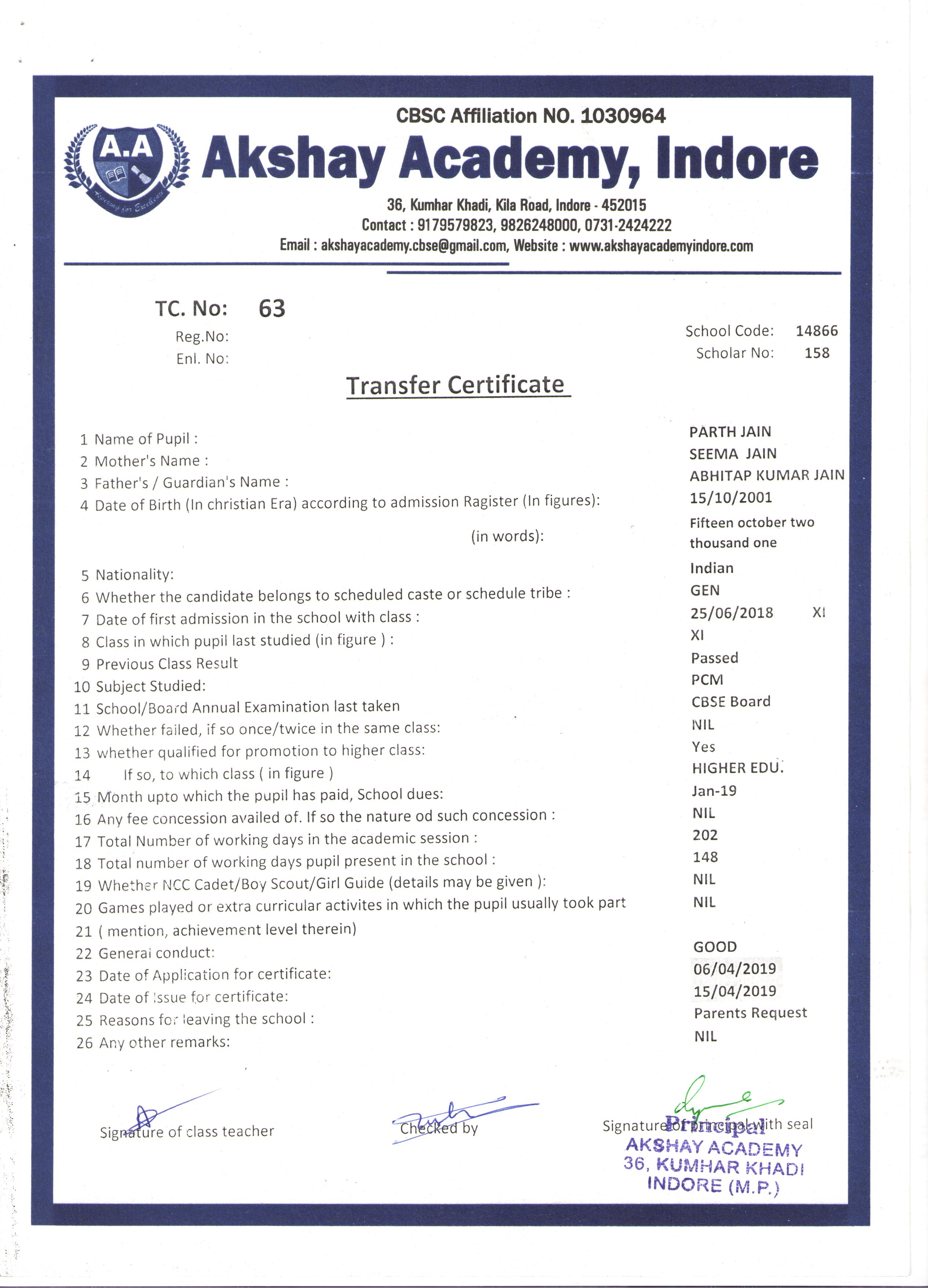 | 063 | PARTH JAIN | ABHITAP KUMAR JAIN | XI | 2018-19 | |
