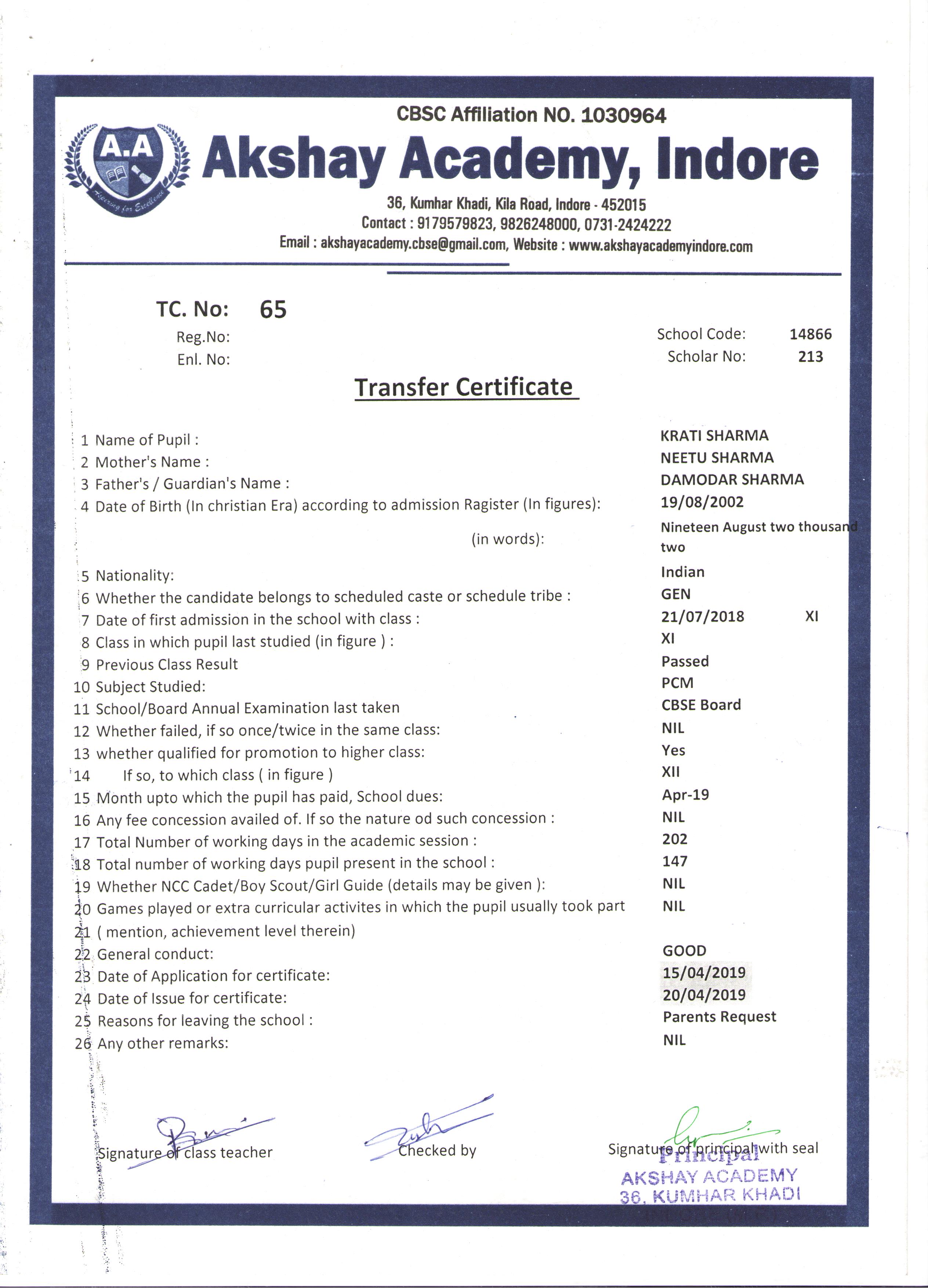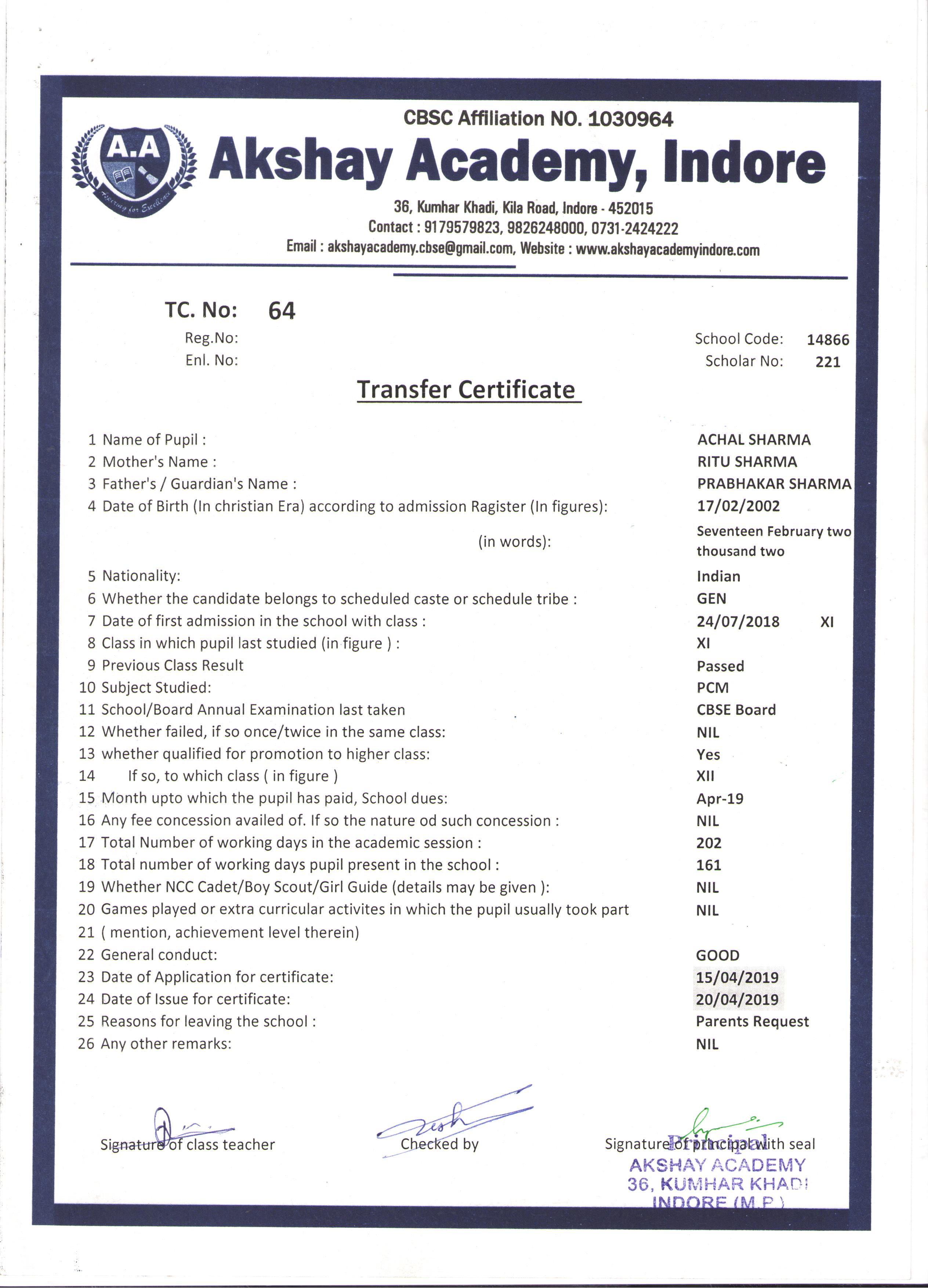 | 064 | ACHAL SHARMA | PRABHAKAR SHARMA | XI | 2018-19 | |