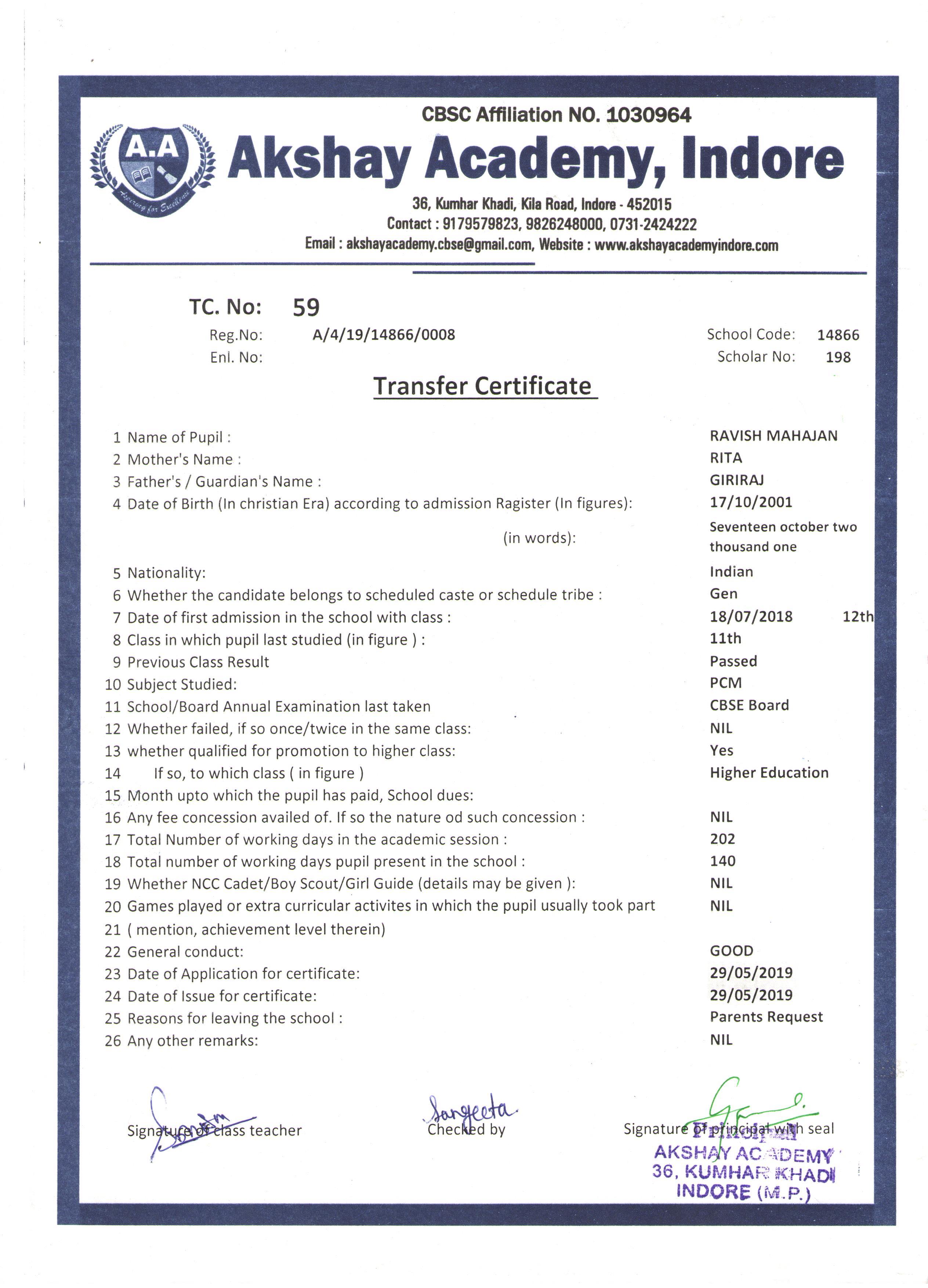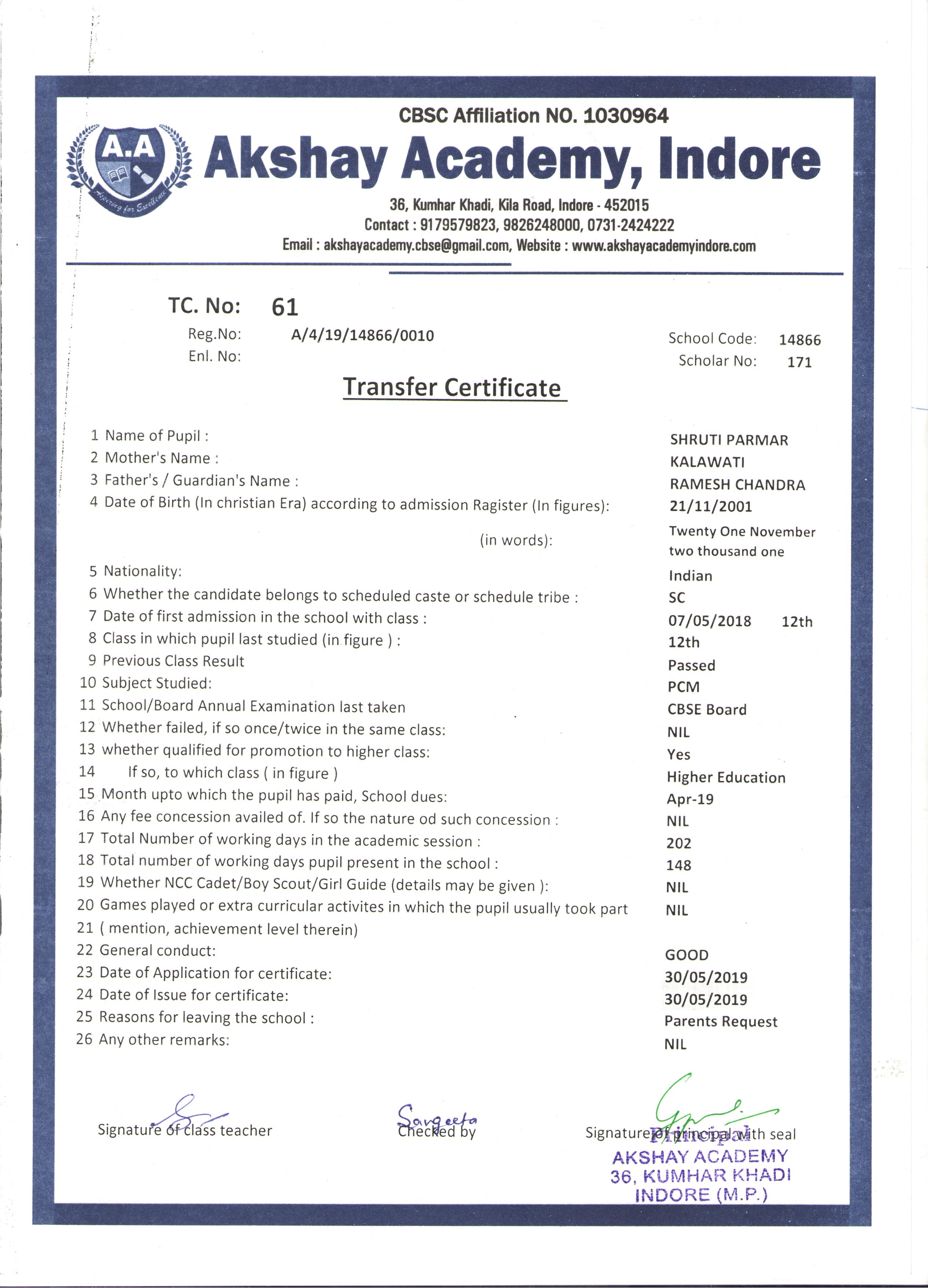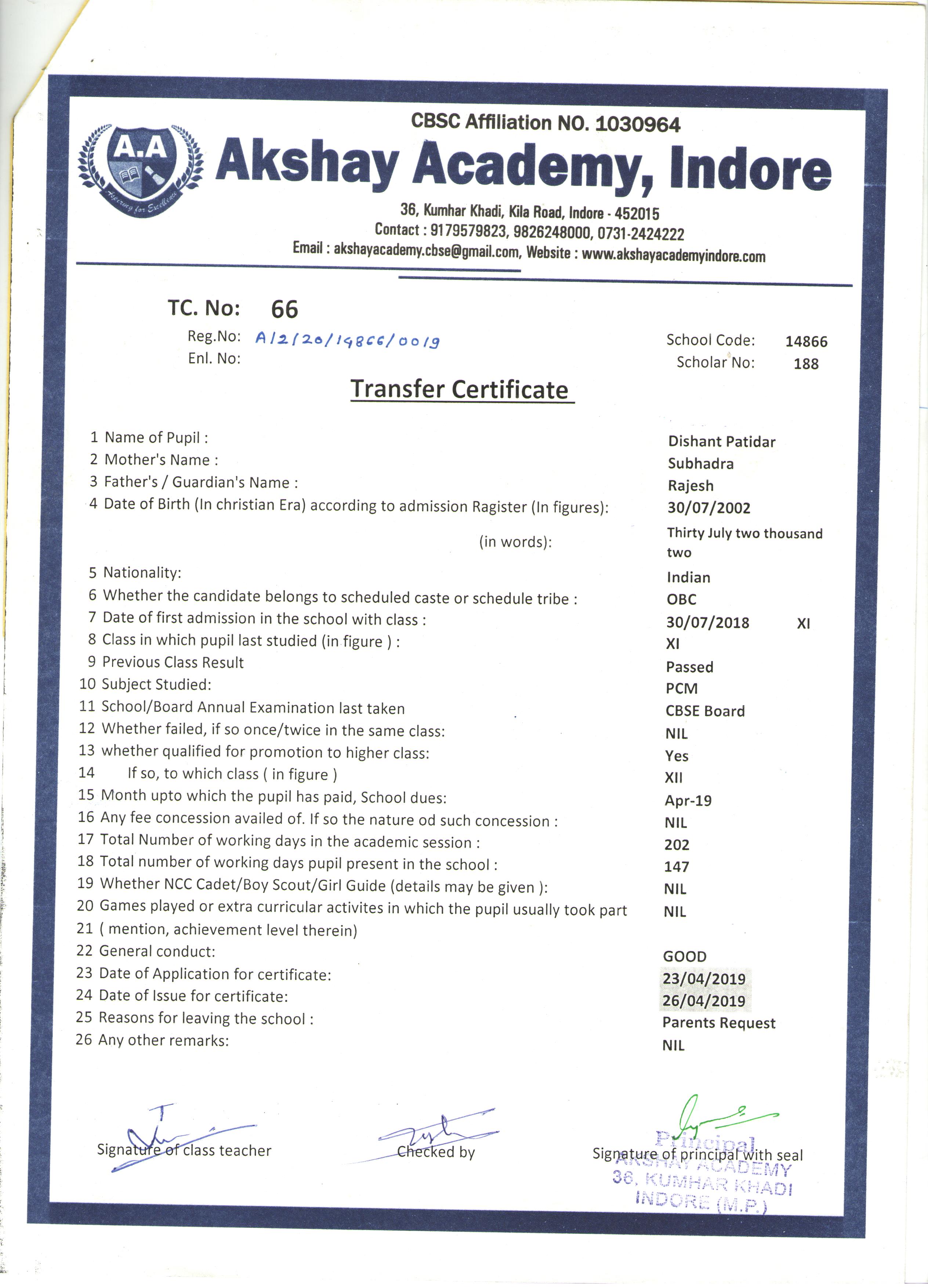 | 066 | DISHANT PATIDAR | RAJESH PATIDAR | XI | 2018-19 | |