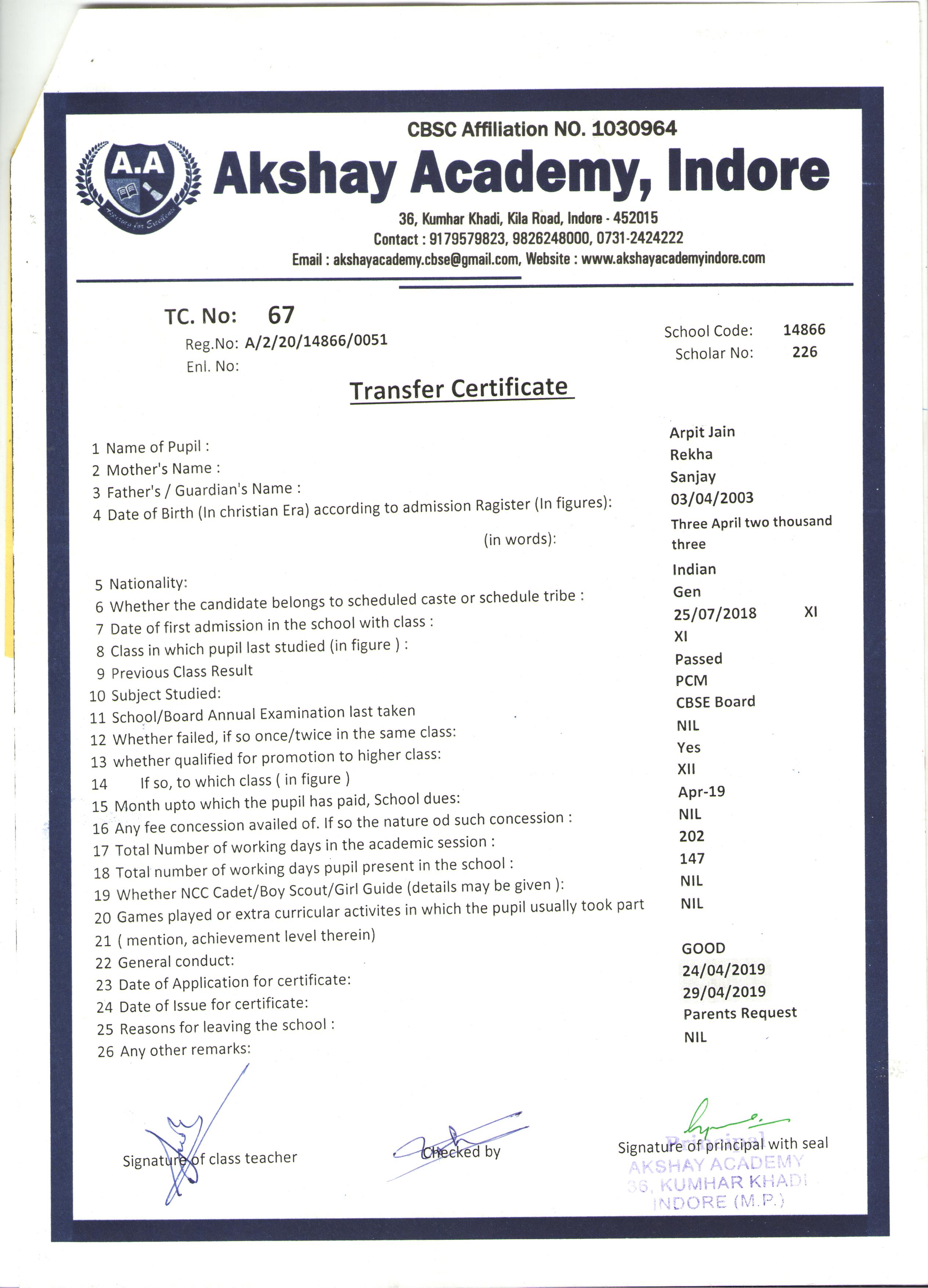 | 067 | ARPIT JAIN | SANJAY JAIN | XI | 2018-19 | |