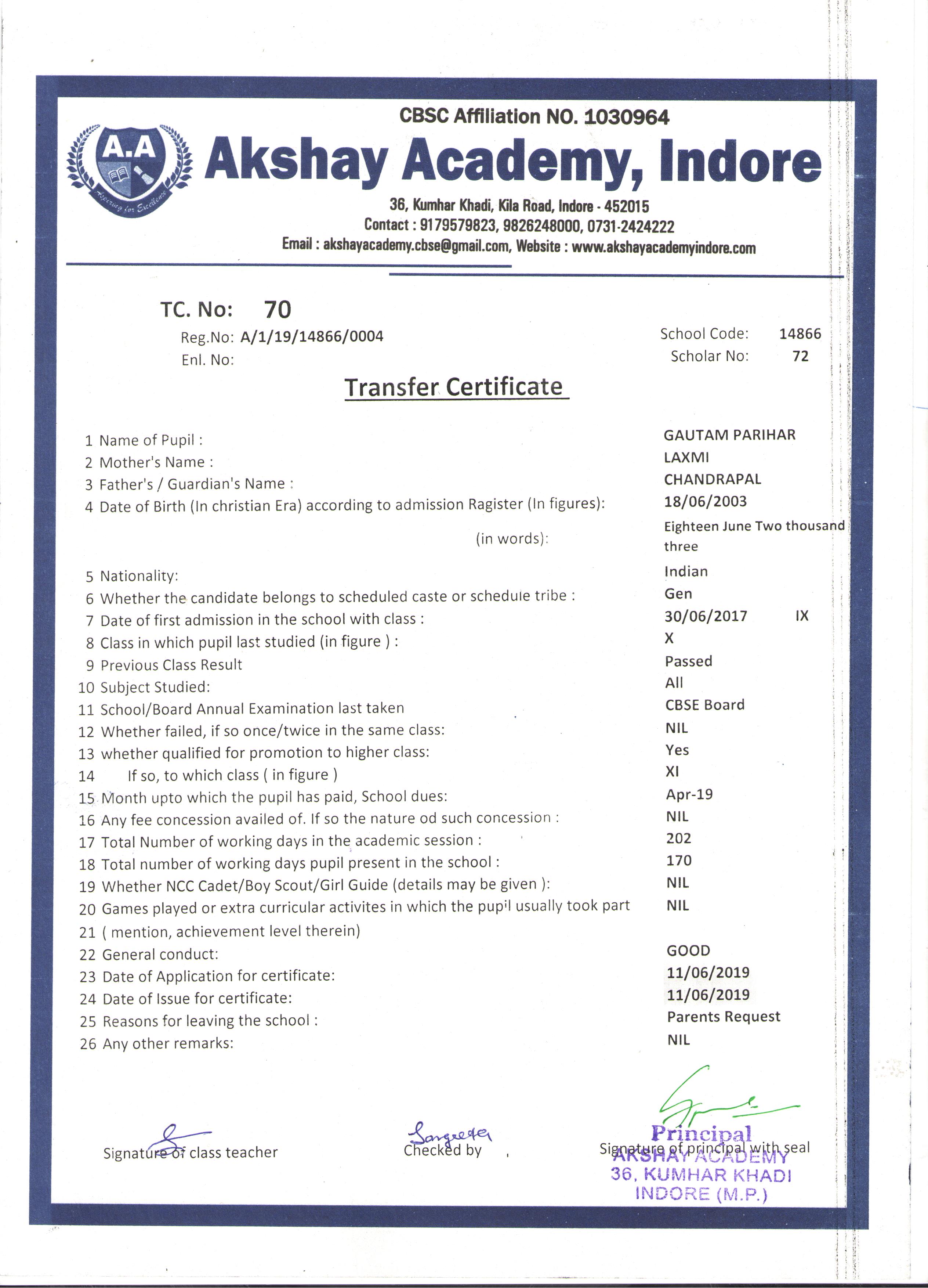 | 070 | GAUTAM PARIHAR | CHANDRAPAL | X | 2018-19 | |