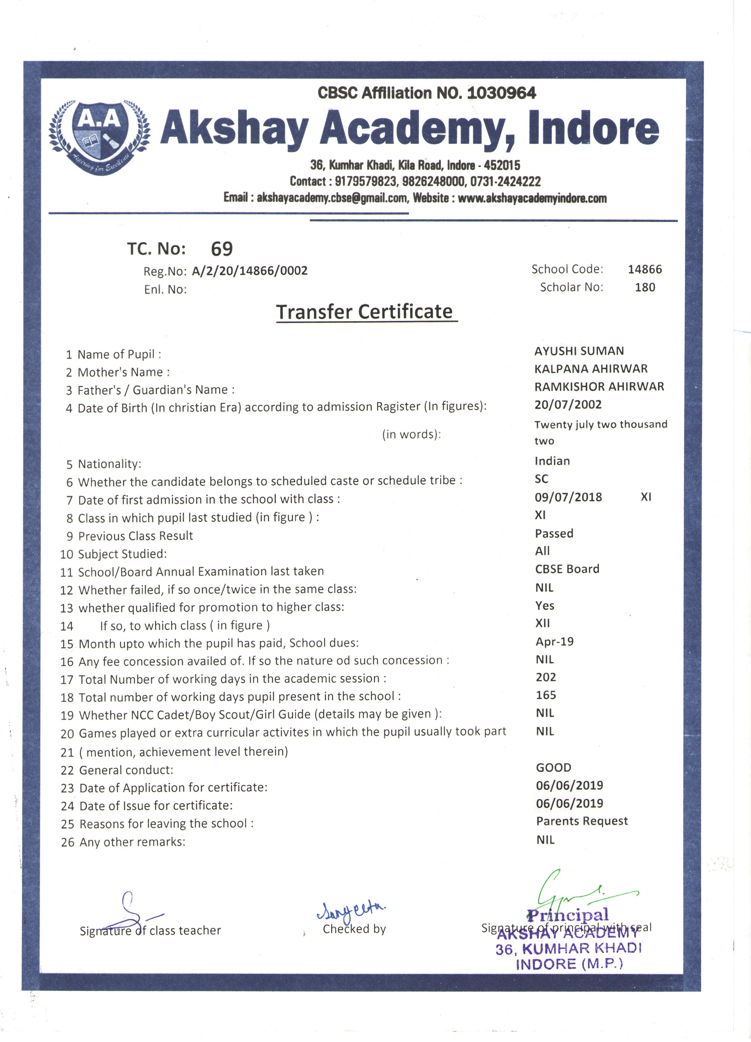 | 069 | AYUSHI SUMAN | RAMKISHORE | XI | 2018-19 | |