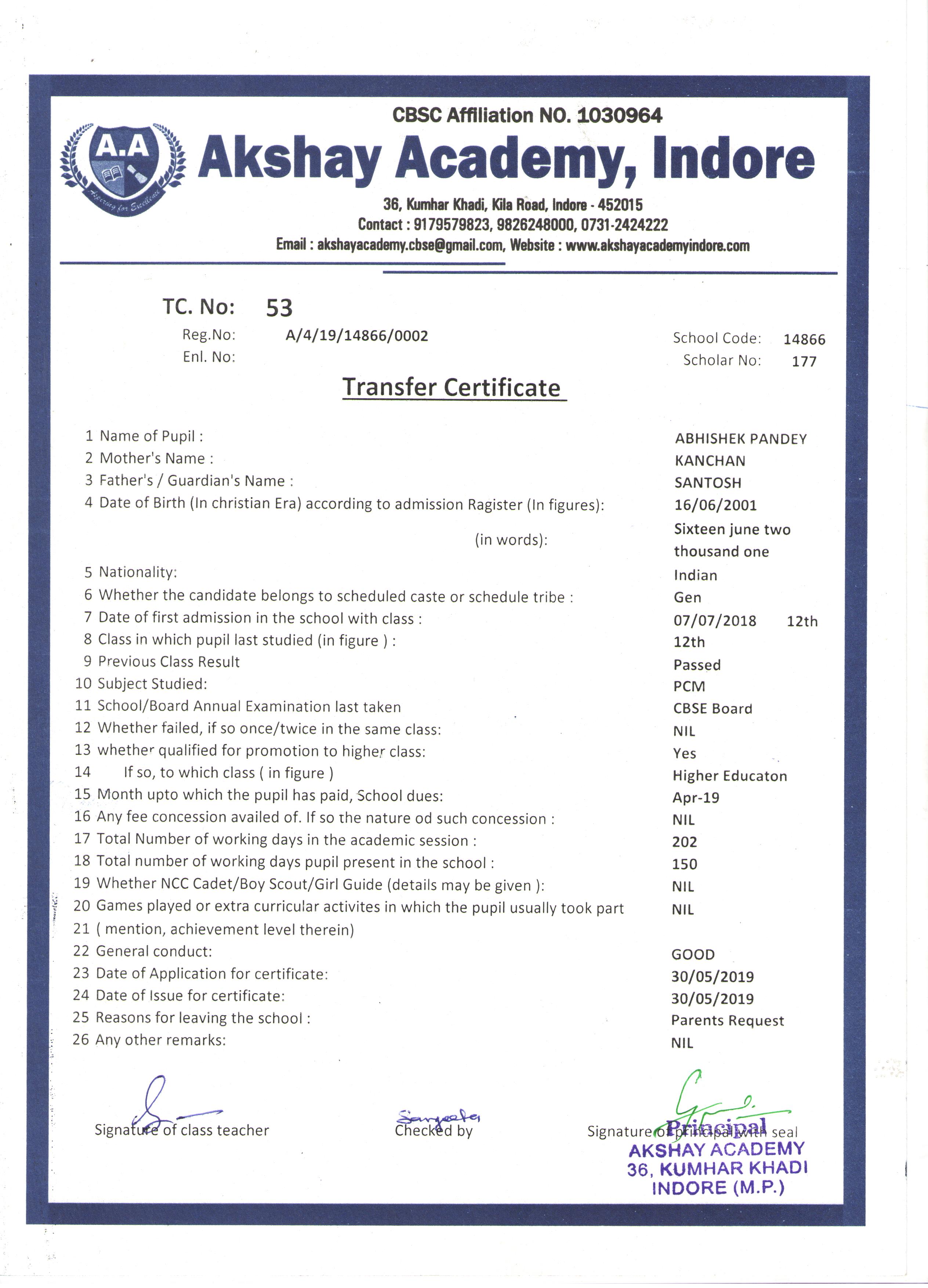 | 053 | ABHISHEK PANDEY | SANTOSH PANDEY | XII | 2018-19 | |