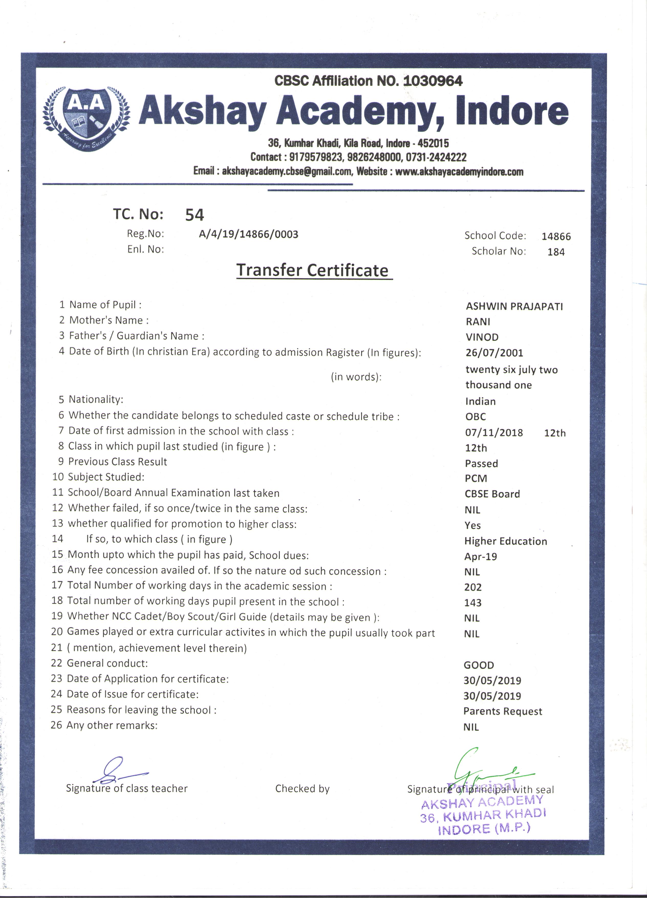 | 054 | ASHWIN PRAJAPATI | VINOD | XII | 2018-19 | |