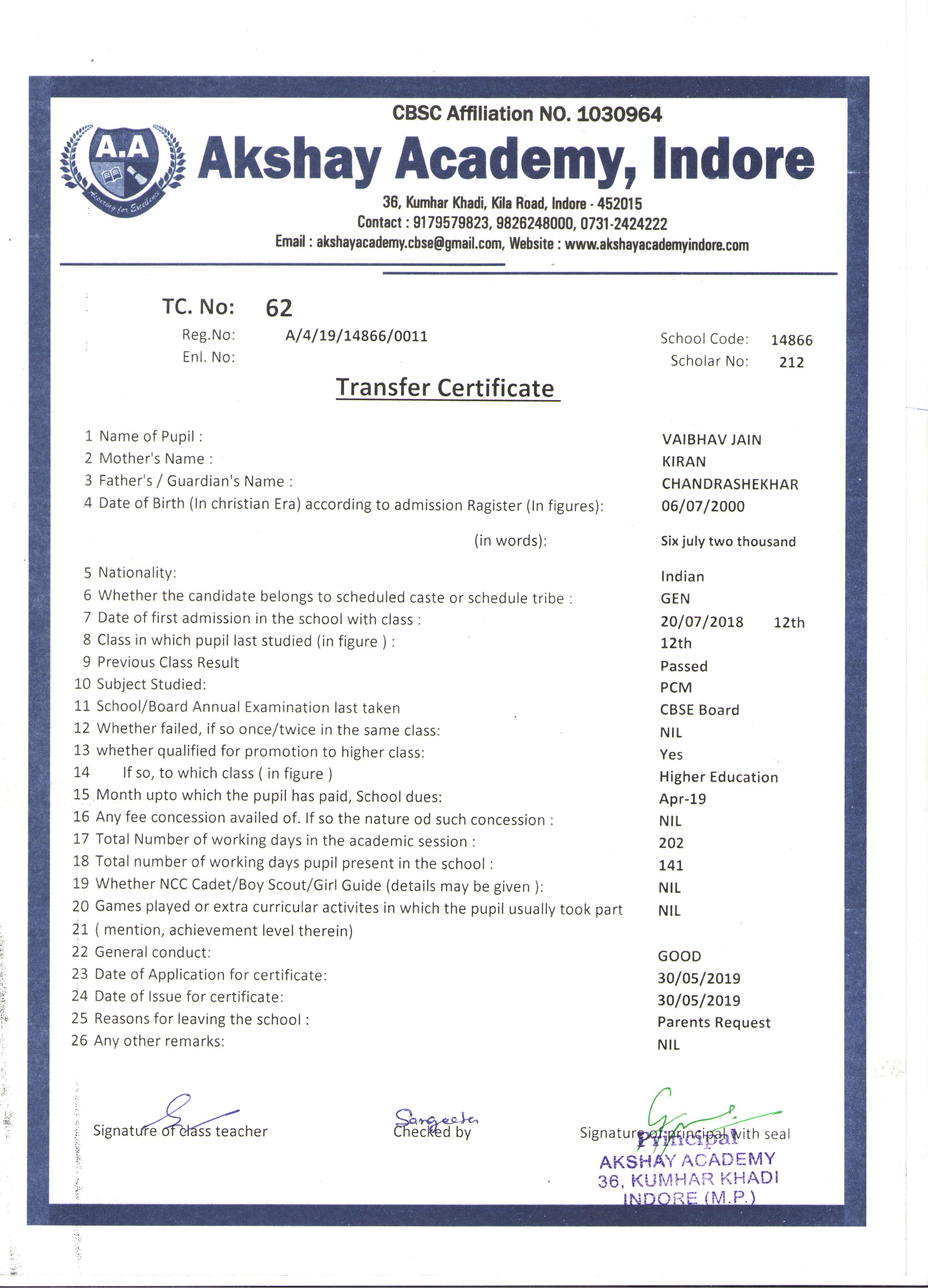 | 062 | VAIBHAV JAIN | CHANDRASHEKHAR | XII | 2018-19 | |