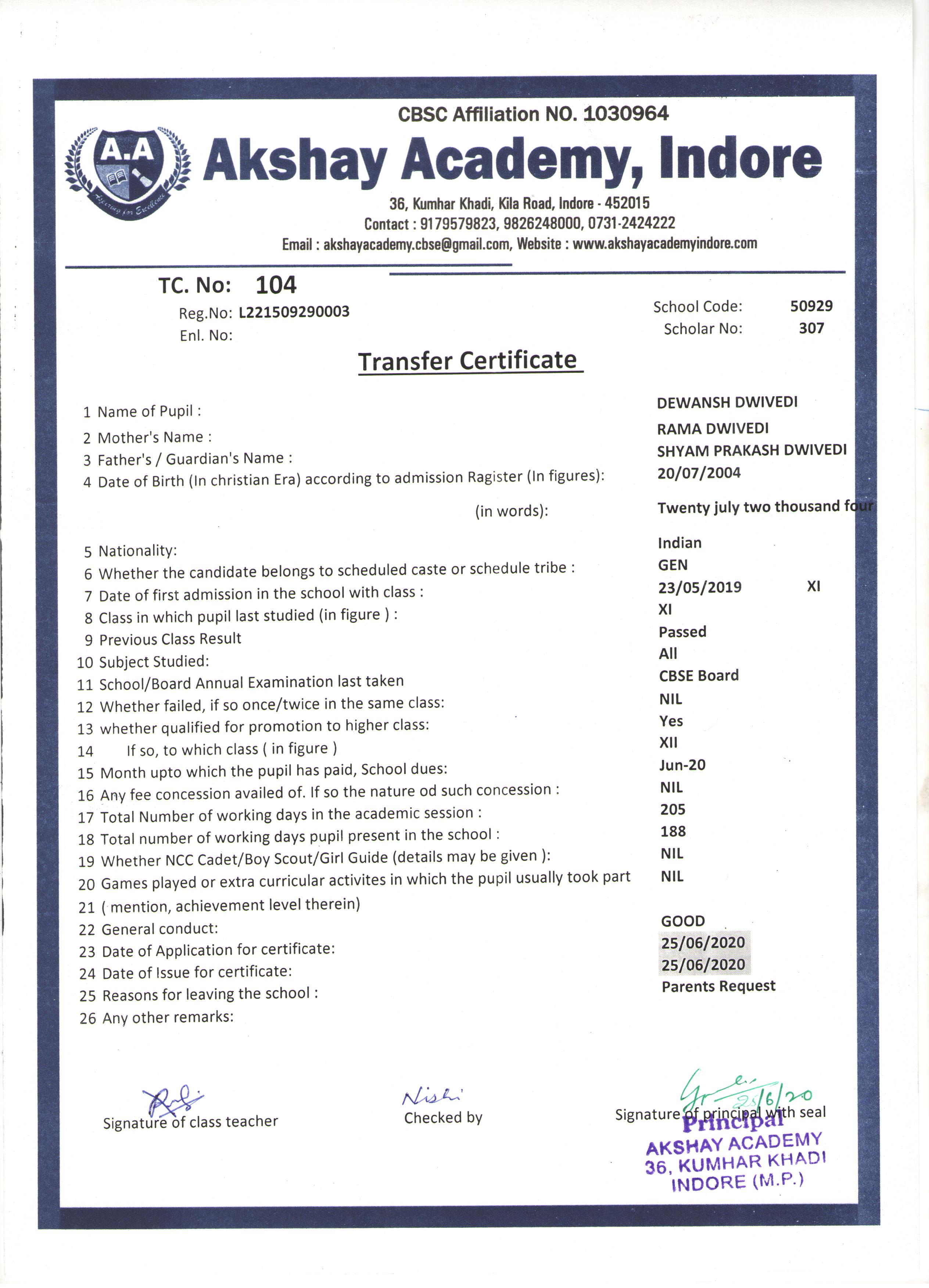 | 104 | Dewansh Dwivedi | Shyam Prakash | XI | 2019-20 | |