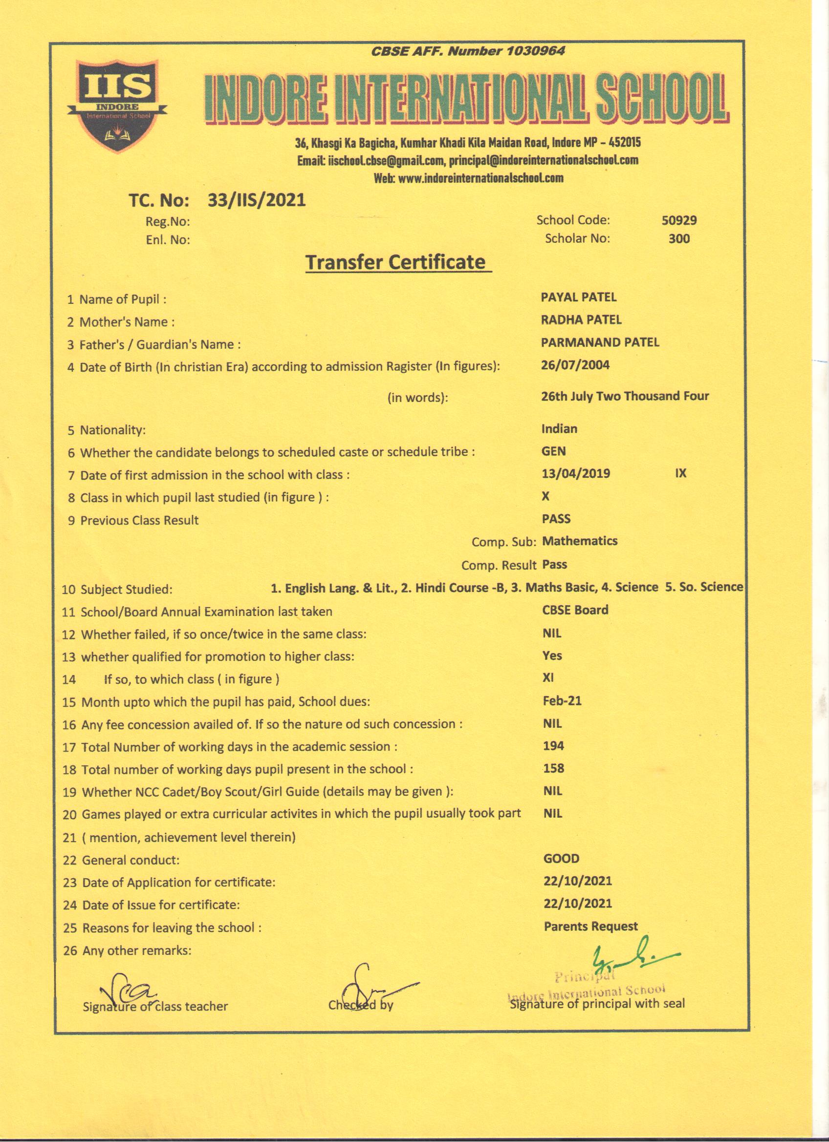 | 33/IIS/2021 | PAYAL PATEL | PARMANAND PATEL | X | 2020-21 | |
