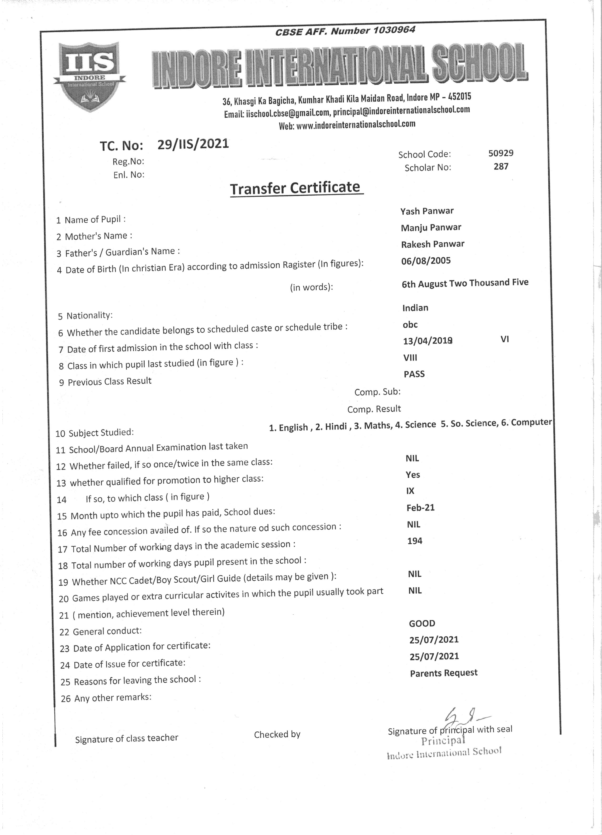 | 29/IIS/2021 | YASH PAWAR | RAKESH | VIII | 2020-21 | |