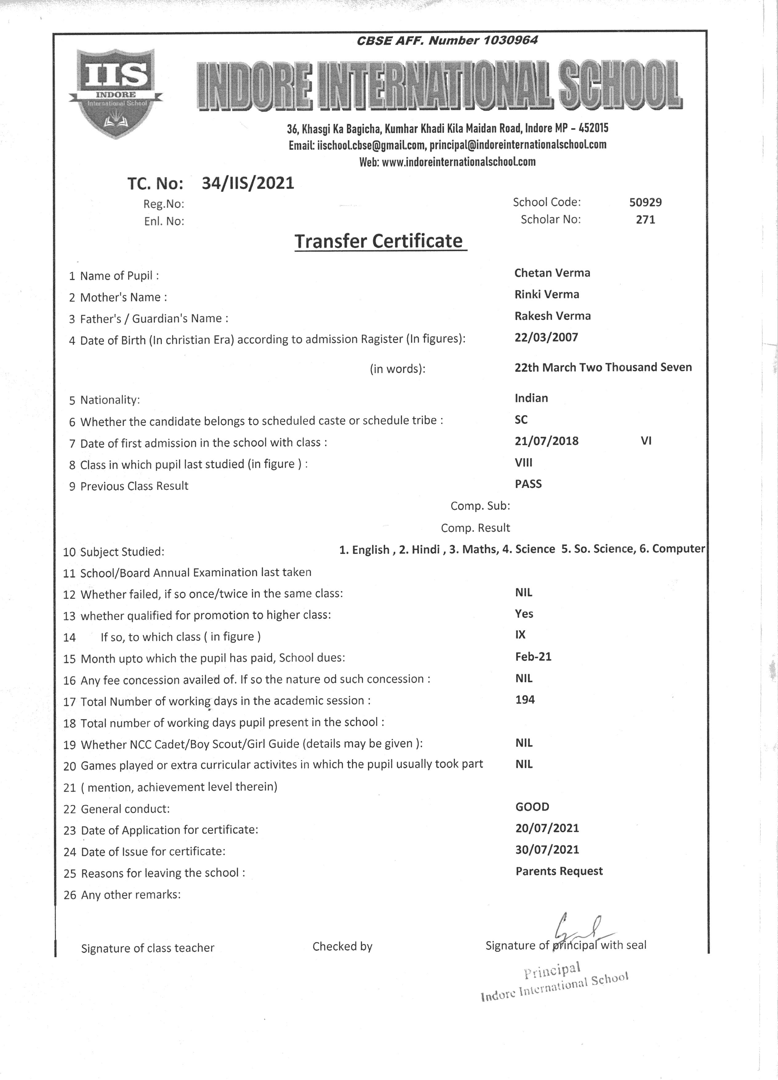 | 34/IIS/2021 | CHETAN VERMA | RAKESH VERMA | VIII | 2020-21 | |