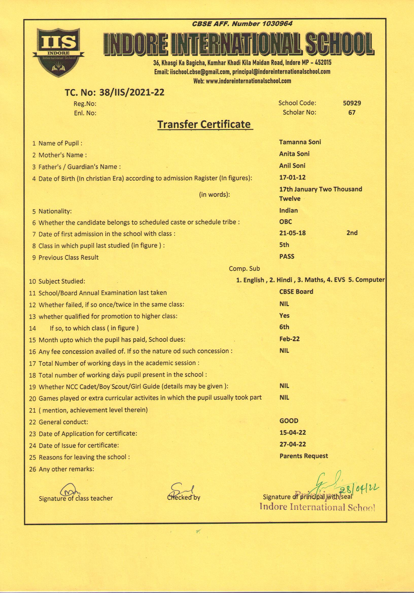 | 38/IIS/2022 | Tamnna Soni | Anil Soni | V | 2021-22 | |