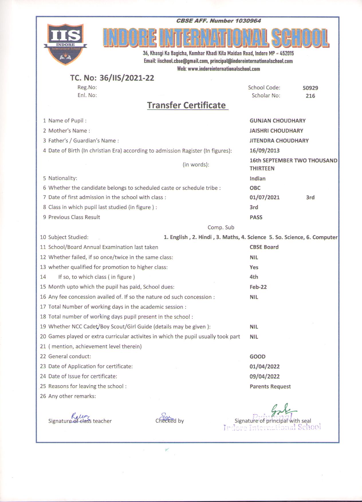 | 36/IIS/2022 | Gunjan Choudhary | Jitendra Choudhary | III | 2021-22 | |