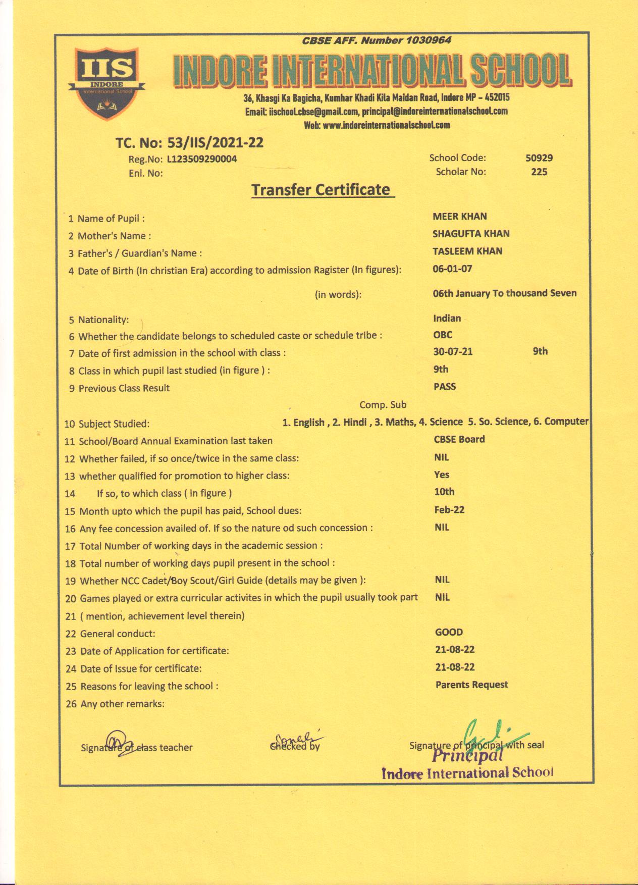 | 53/IIS/2022 | Meer Khan | Tasleem | IX | 2021-22 |