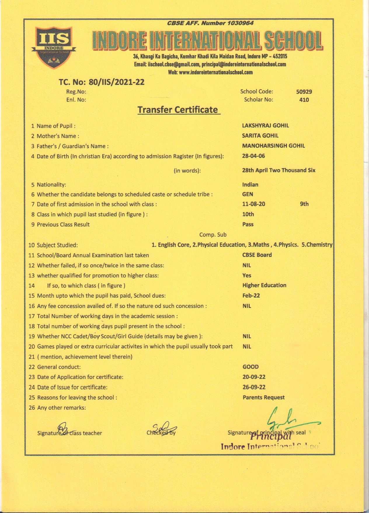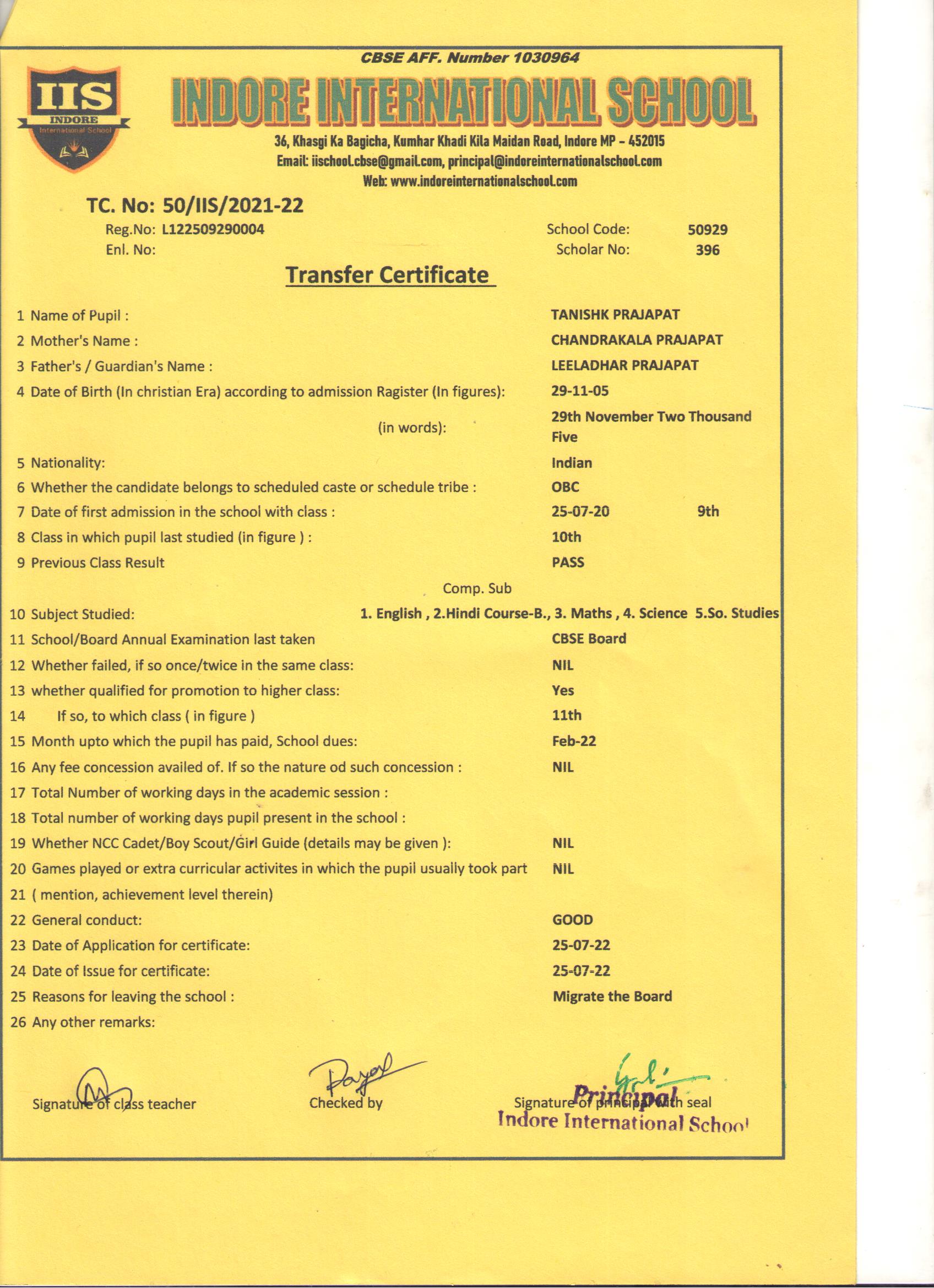 | 50/IIS/2022 | Tanishk Prajpat | Leeladhar Prajapat | X | 2021-22 | |