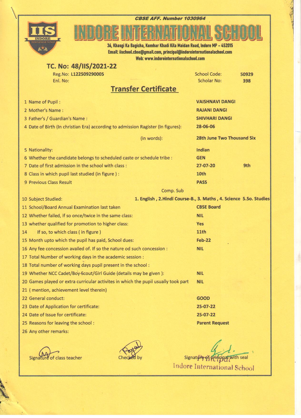 | 48/IIS/2022 | Vaishnavi Dangi | Shivhari | X | 2021-22 | |