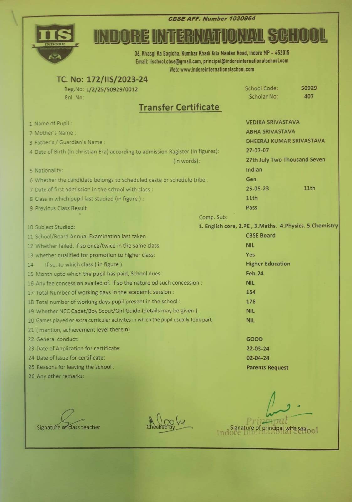| 172-IIS-24 | VEDIKA SHRIVASTAV | DHEERAJ | XI | 2023-24 | |