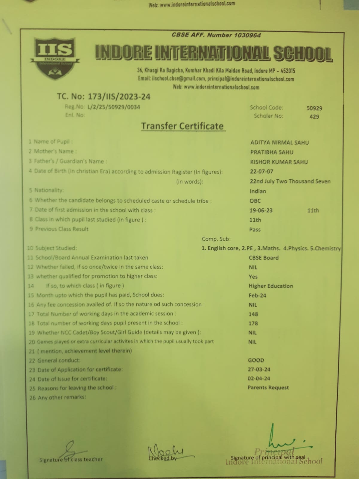 | 172-IIS-24 | ADITYA NIRMAL SAHU | KISHOR KUMAR | XI | 2023-24 | |
