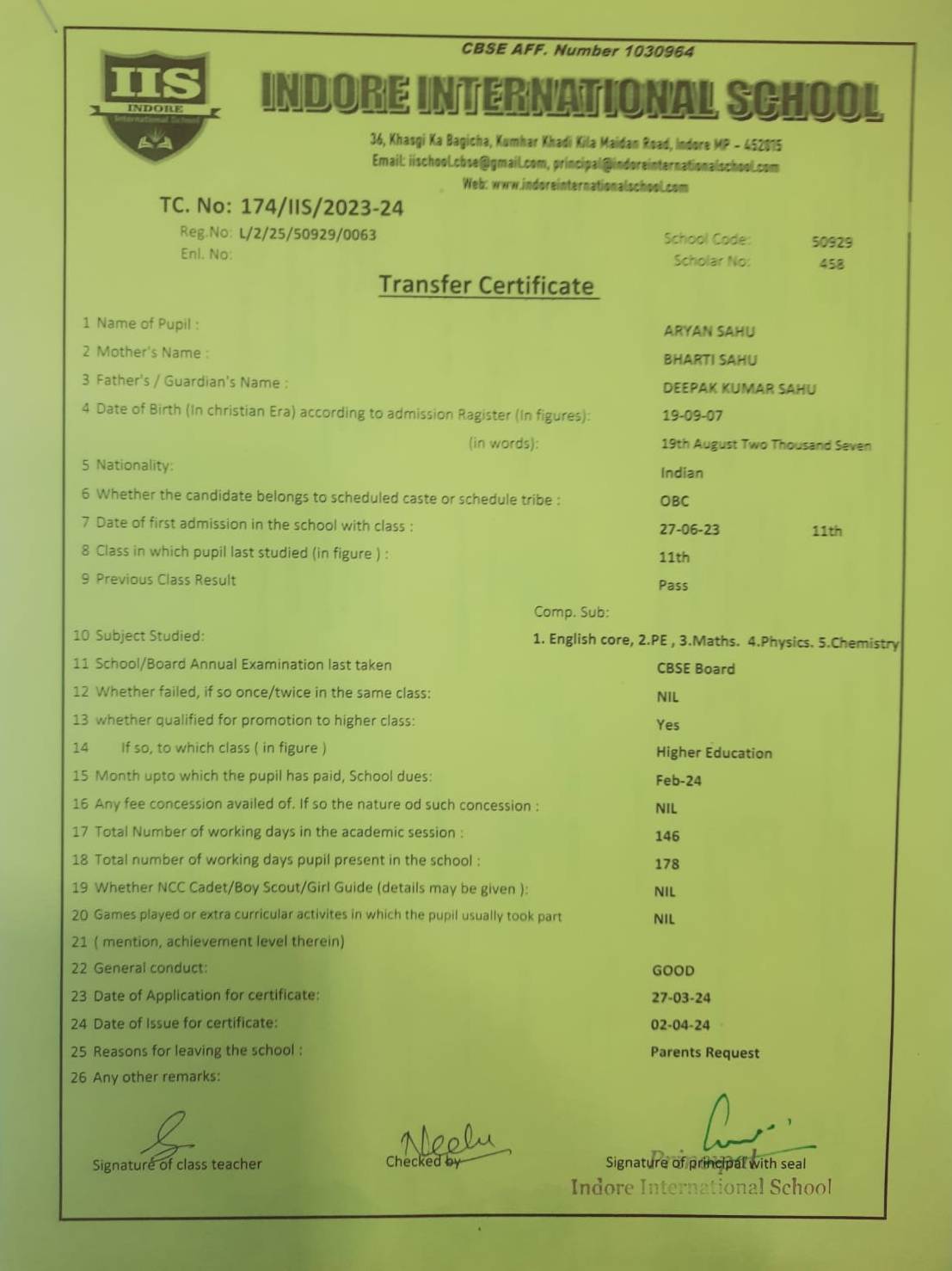 | 174-IIS-24 | ARYAN SAHU | DEEPK KUMAR | XI | 2023-24 | |