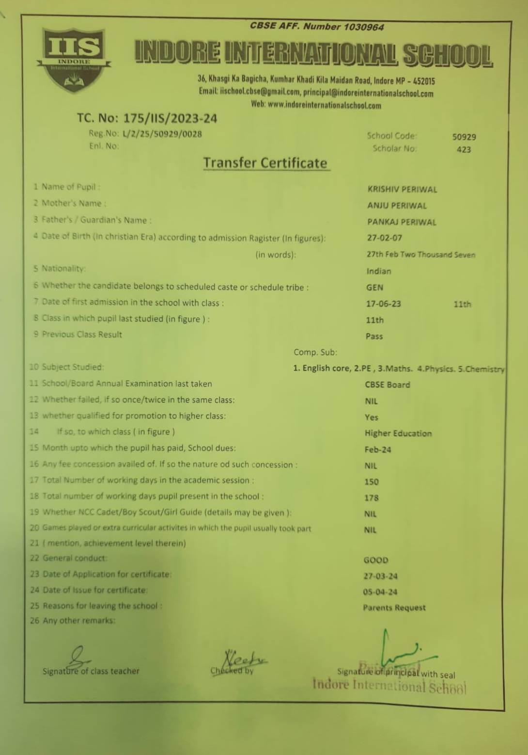 | 175-IIS-24 | KRISHIV PERIWAL | PANKAJ PERIWAL | XI | 2023-24 | |