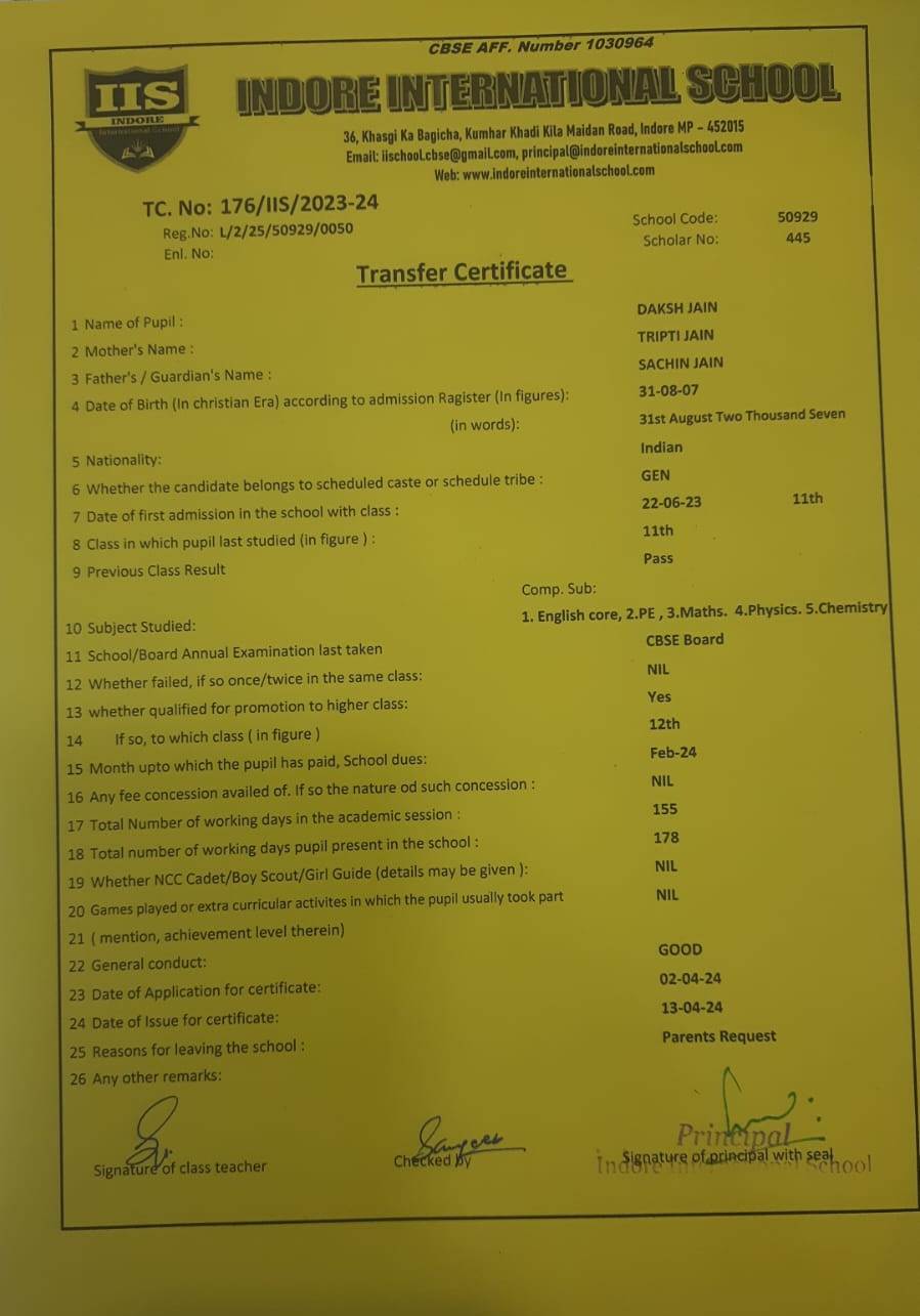 | 176-IIS-24 | DAKSH JAIN | SACHIN JAIN | XI | 2023-24 | |