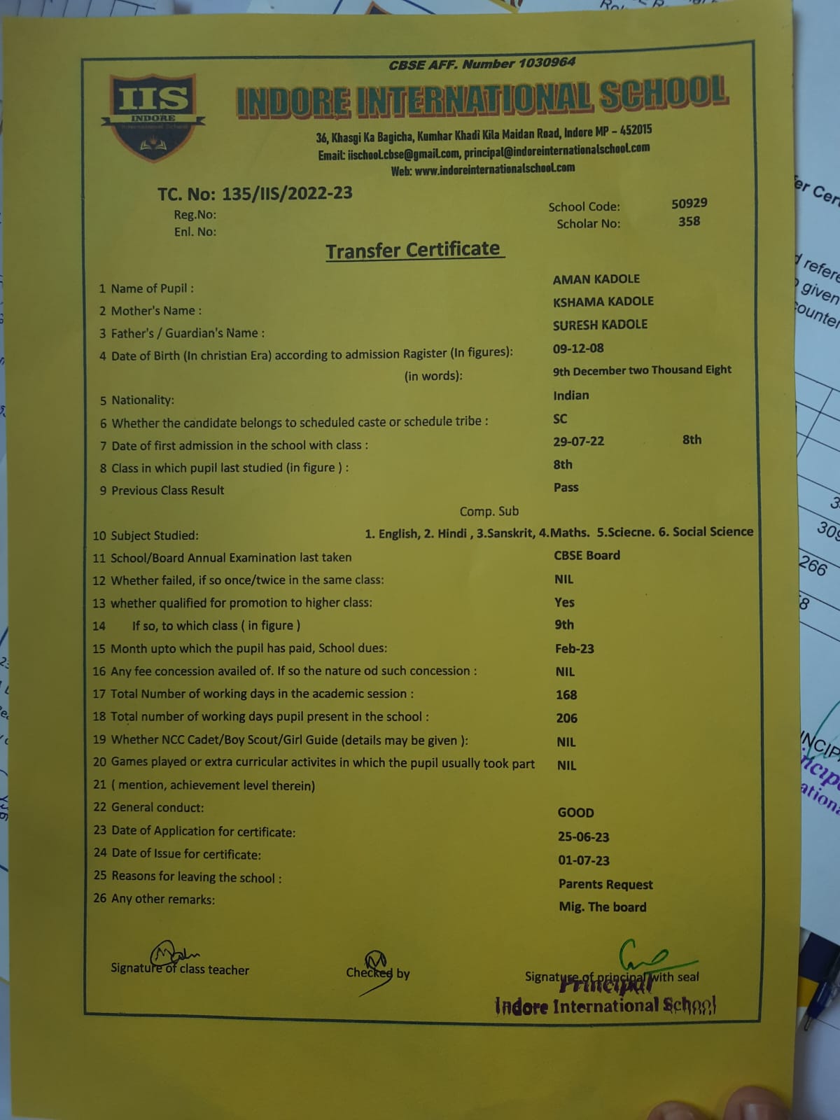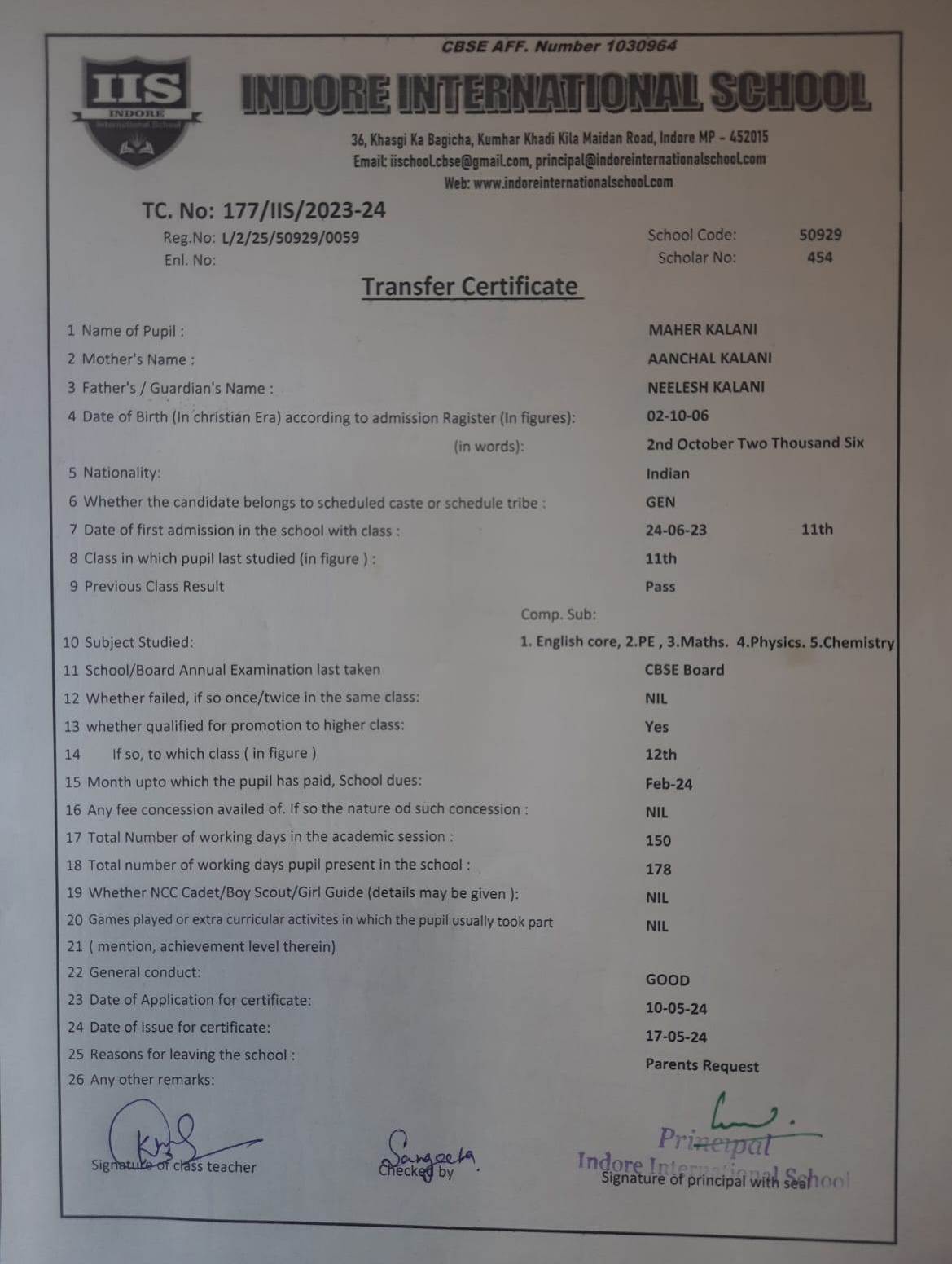 | 177-IIS-24 | MAHER KALANI | NEELESH KALANI | XI | 2023-24 | |
