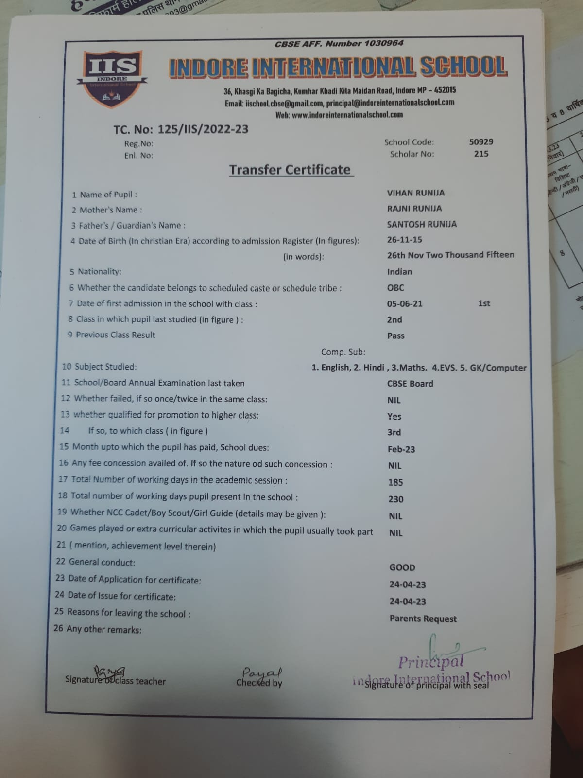 | 125-IIS-23 | VIHAN RUNIJA | SANTOSH | II | 2022-23 | |
