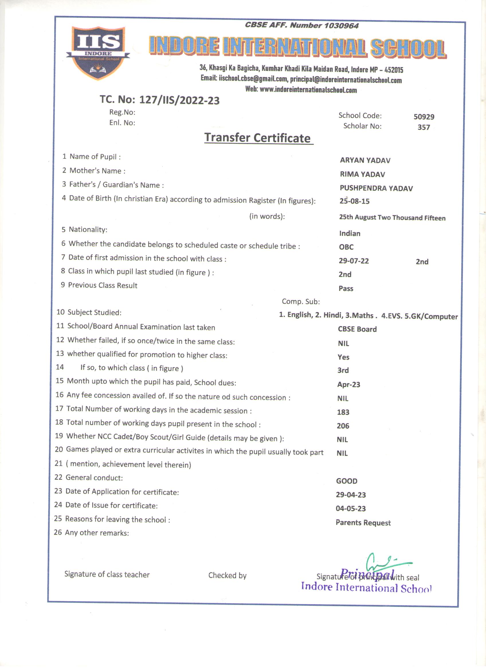 | 127-IIS-23 | ARYAN YADAV | PUSHPENDRA | II | 2022-23 | |