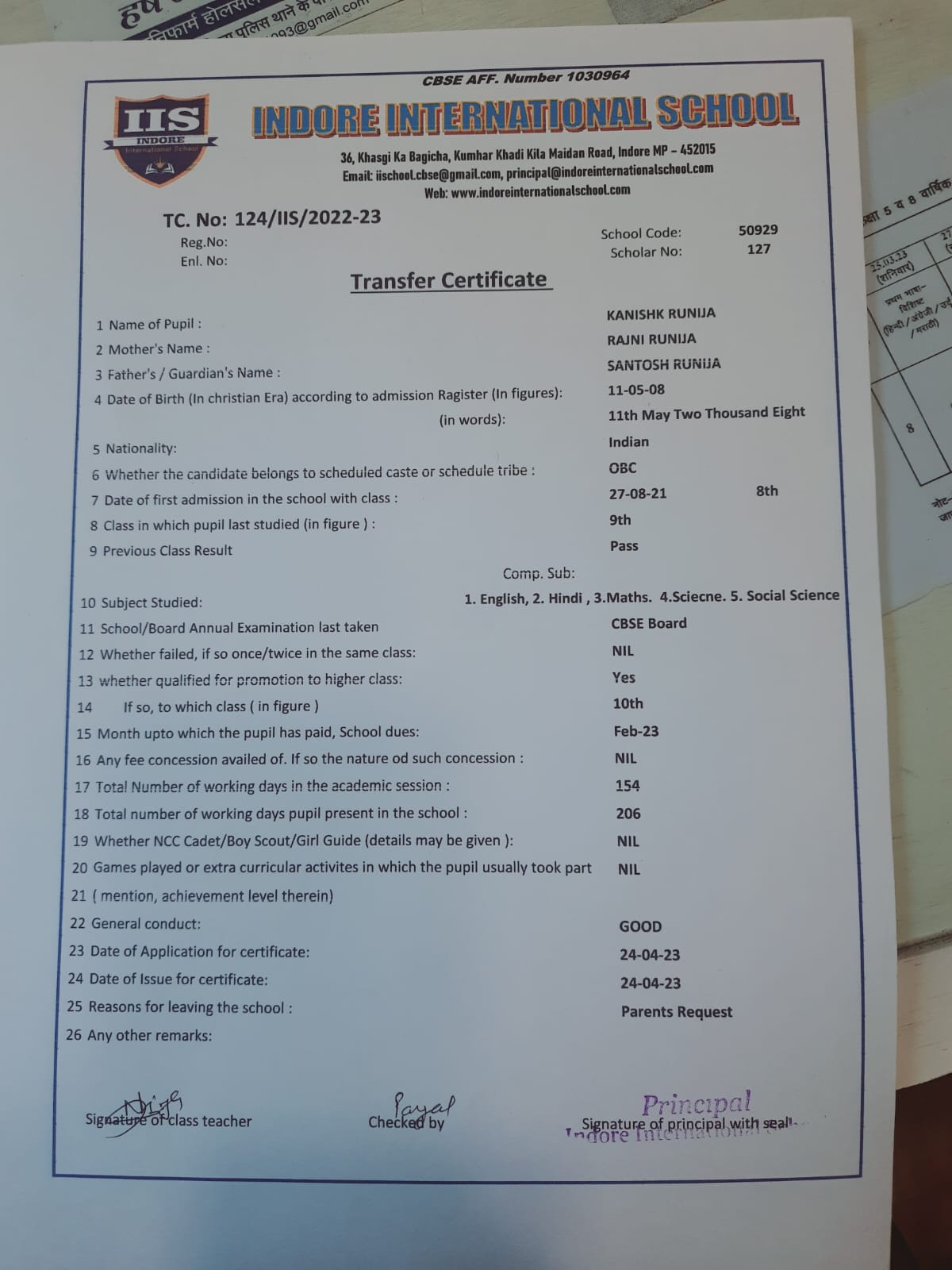 | 124-IIS-23 | KANISHK RUNIJA | SANTOSH | IX | 2022-23 | |
