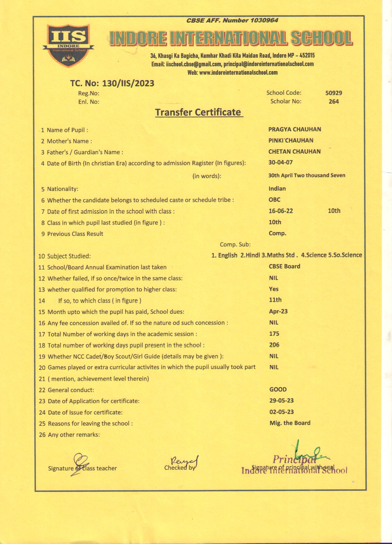 | 130-IIS-23 | PRAGYA CHOUHAN | CHETAN CHOUHAN | X | 2022-23 | |