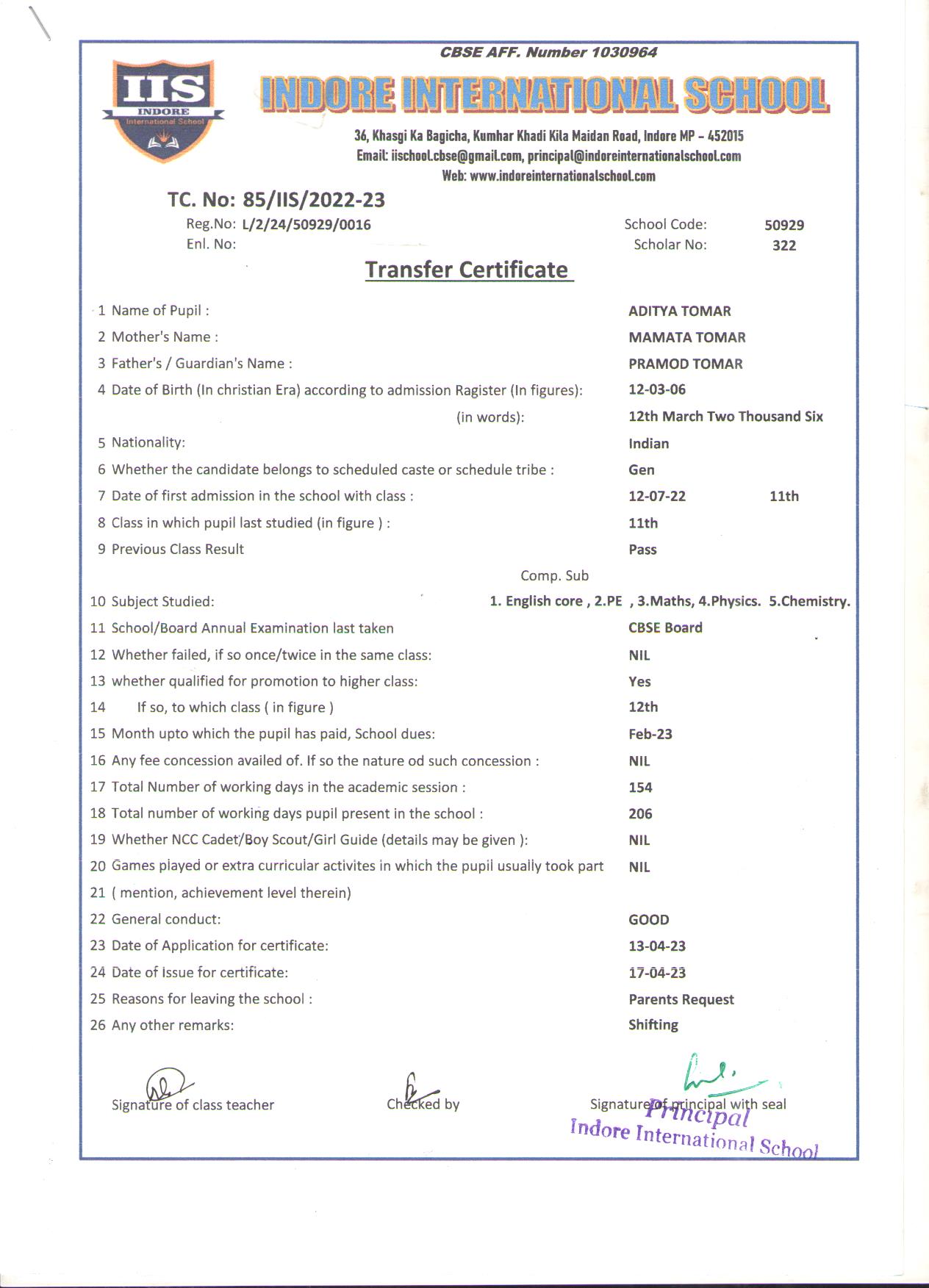 | 85-IIS-23 | ADITYA TOMAR | PRAMOD | XI | 2022-23 | |