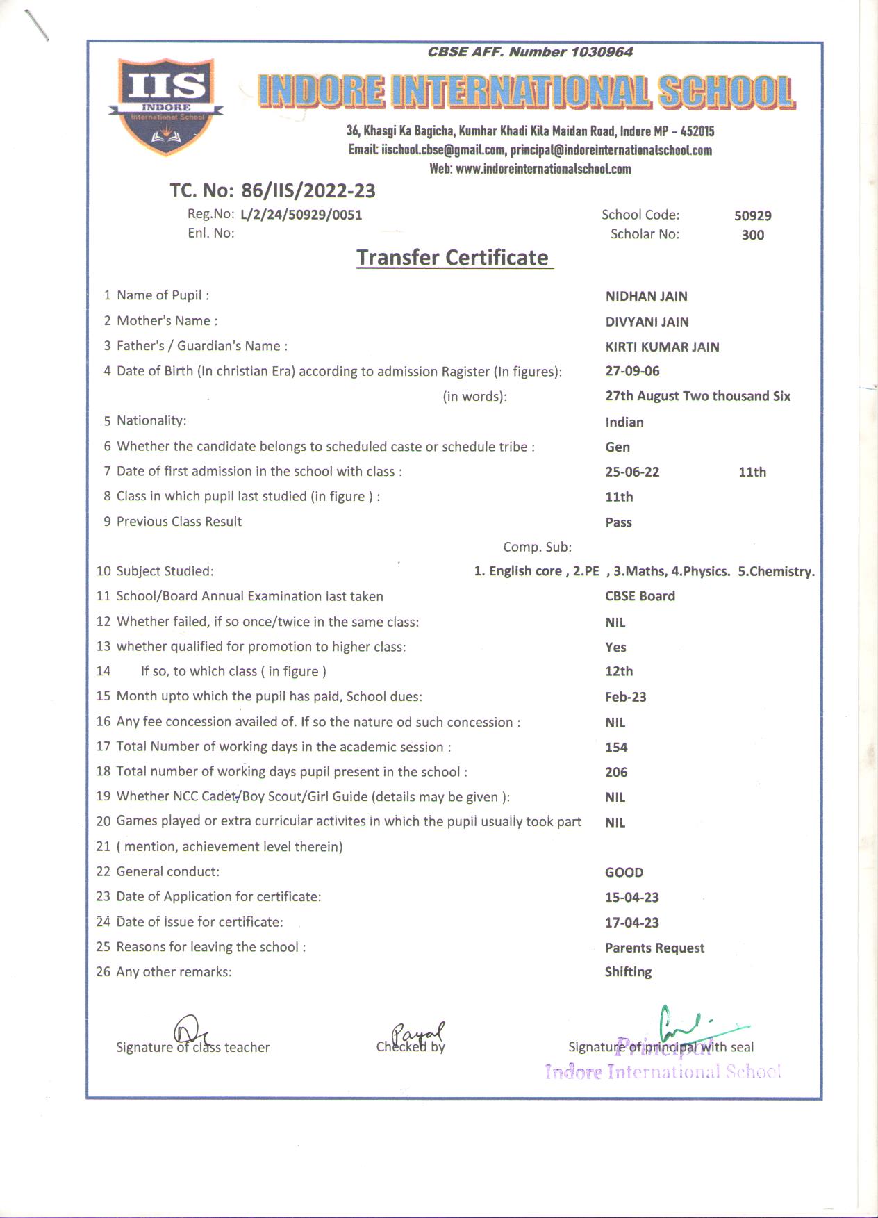 | 86-IIS-23 | NIDHAN JAIN | KIRTI KUMAR JAIN | XI | 2022-23 | |