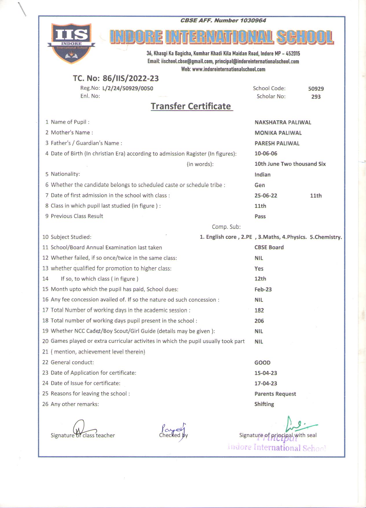 | 86-IIS-23 | NAKSHATRA PALIWAL | PARESH | XI | 2022-23 | |